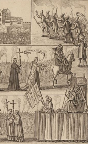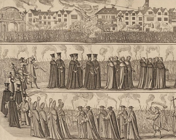 查理二世统治期间,天主教徒与新教徒明争暗斗,冲突不断,对社会的安定造成了极大破坏。这幅图出自一份1679年报纸,正逢宗教矛盾愈演愈烈之时,描绘了教皇游行的场面