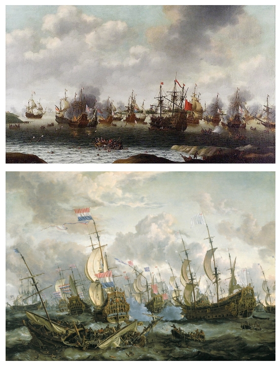 查理二世统治期间的荷兰入侵,史称“第二次英荷战争”,起因于英国订立更严苛的航海法,并占领荷兰位于北美的殖民地新阿姆斯特丹(今纽约)。图为荷兰入侵期间英国舰队与荷兰舰队发生战斗