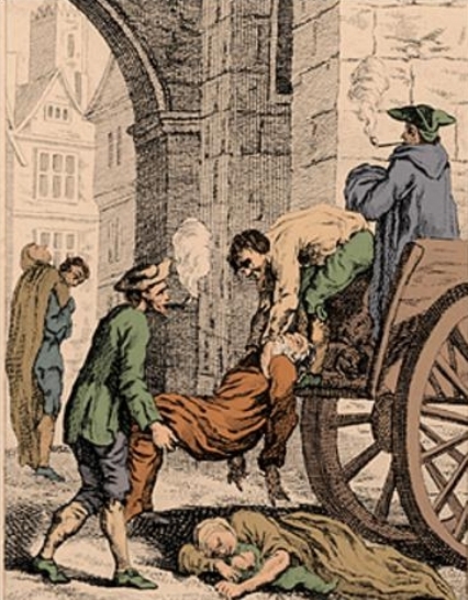 1665年,伦敦爆发了大瘟疫,给民众造成了巨大灾难。图为收尸人把病死的人装上牛车。绘者信息不详