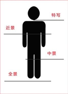 景别有五种类型:远景、全景、中景、近景、特写。一般以一个站立着的人来划分景别。全景指人体的全部及周围环境。中景指人体膝部以上。近景指人体胸部以上。特写指人体肩部以上。