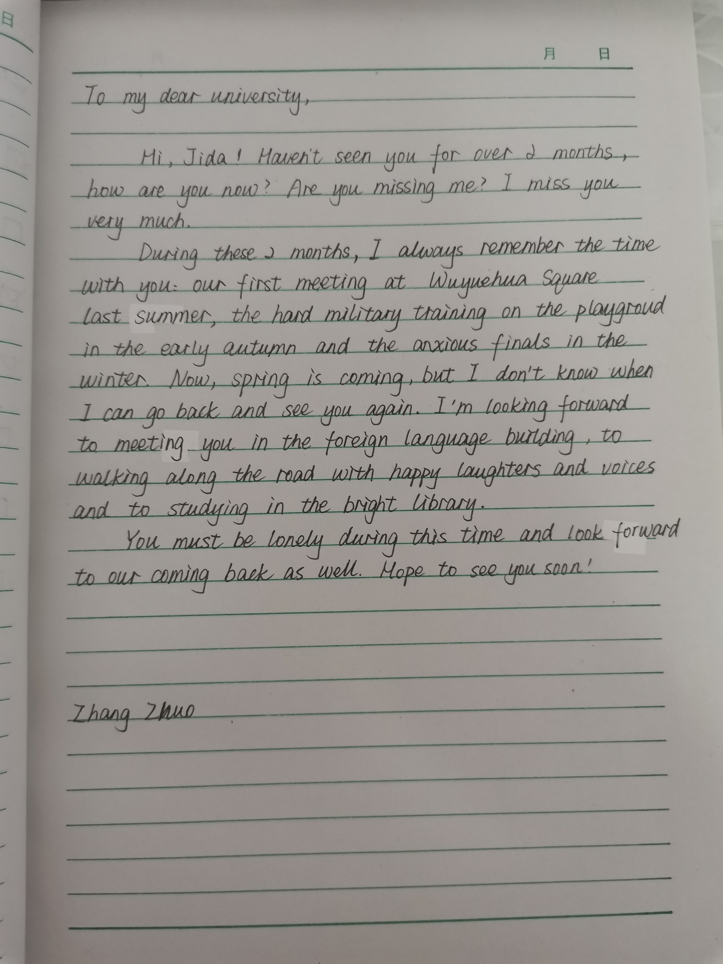 9. Draw a picture, write an essay, or a poem about your impression of Jilin University since you can not come back to school now and upload it to xuexitong. (20 mins)