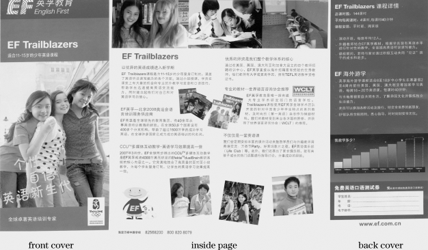 The English learning advertisements are multimodal documents which incorporate resources of more than one semiotic system,such as language,pictures,color,diagrams and typographical features.Most of them take the form of a color leaflet which consists of four or six pages and can be folded.Only a few are single-leaf advertisements which have a front and back page.Some language schools even include a booklet in their promotional material which consists of a large number of pages with detailed information of the courses they provide.On each of the leaflet there are photos,drawings,chunks of verbal text and sometimes graphs.The quantity of both verbal texts and images in many leaflets could be said to be rather large,for instance,a leaflet has a composite of about 1,000 Chinese characters and 6 pictures on one page only,not including pictures and texts on other pages and two covers.Roughly speaking,there are altogether approximately 100,000 words and several hundreds of visual images under examination.A sample of these leaflets is given in Figure 1.1 below.