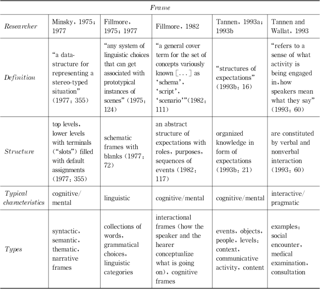 Following Fillmore,Bednarek used the term“frame”as the cover term of all these competing terms.She defined frame as“a mental knowledge structure which captured the‘typical’features of the world”.She believed that frame had become a term associated and linked with different,though related phenomena due to the lack of consistent terminology.The overview of the various connotations of the term by various scholars is presented in Table 2.3.