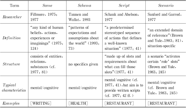 The current problem is that the knowledge structure is discussed in different terminology in linguistics.Script,schema,scenario and frame are the frequently encountered ones among the theories on the mental construction of global coherence.These terms usually differ only in emphasis and cannot easily be distinguished.An excellent overview of these competing terms is offered in Bednarek(2005)(see Table 2.2).