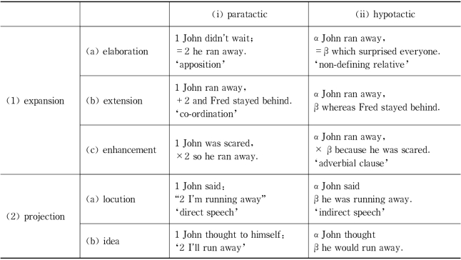 Halliday's“clause complexes”is another theory that has been widely applied in the description of local coherence in discourses.Halliday(1994)classifies the relations between sentences,or“clause complexes”in their terminology,in two dimensions:(i)the type of interdependency,or Taxis;(ii)the logico-semantic relation.In the first dimension,two general categories,hypotaxis and parataxis are described.The former is the relation between a dependent element and its dominant.The latter is the relation between two elements of equal status,one initiating and the other continuing.Along the second dimension,he discusses the various logico-semantic relations which might hold between two clauses in a clause nexus.Two general types are identified:expansion and projection.By expansion,the secondary clause expands the primary clause,by elaborating,extending or enhancing it.By projection,the secondary clause is projected through the primary clause,which instates it as a locution or an idea.Under each of these major categories,there are finer classifications which will not be elaborated here.His main framework is presented in Table 2.4 below: