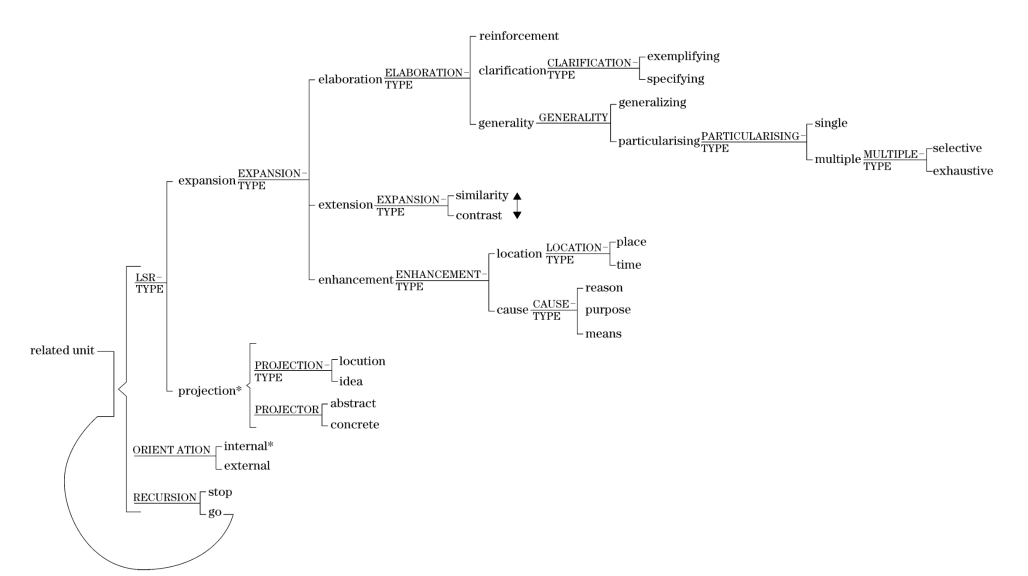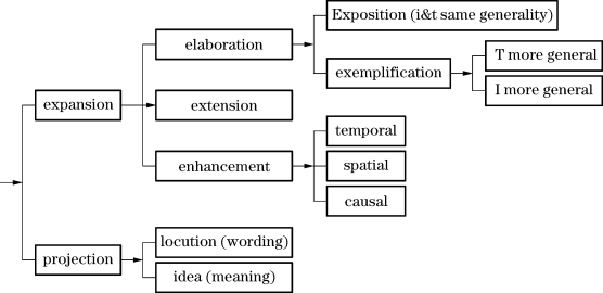 Djonov's doctoral dissertation(2005)includes a section on the discussion of visualverbal relations in hypermedia discourse.Her framework(see Figure 2.3)draws upon Halliday's(1994)categories of logical relations in clause complexes,although some subbranches are made on the basis of semantic labeling between different modes,such as exemplifying,generalizing,particularizing,and similarity.