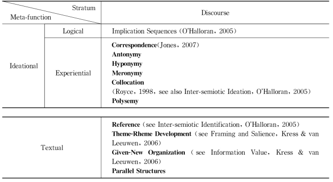 Liu and O'Halloran(2009)addresse the problem of cohesion and coherence between different modes in multimodal discourses.They first summarize the multiple systems developed by different people and re-organize them into the meta-function framework of Systemic Functional Linguistics(see Table 2.6).Then based on the examination of Inter-Semiotic Parallelism,Inter-Semiotic Polysemy,and a discourse-based Implication Sequences,the authors propose a“discourse-based”way to approach the different kinds of logical relations between language and images in multimodal discourses“to complement existing grammar-based models(e.g.,Martinec and Salway,2005;Unsworth,2006)”.Their model of inter-semiotic logical relations is shown in Figure 2.6.