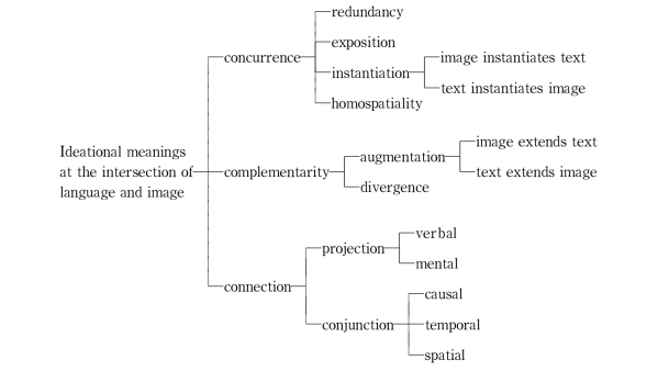 Unsworth(2006)adopts the SFL's social semiotic perspective towards text-image relations and describes them according to the three types of meanings respectively—ideational,interpersonal and textual.However,a systematic framework is raised only in ideational meaning.In terms of ideational meaning,this language-image interaction may be characterized as ideational concurrence,complementarity or connectio n.Each of them has a finer categorization(see Figure 2.6 for illustration).