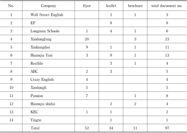 97 print materials of 14 English language schools in Haidian district,Beijing were collected.These materials include leaflets,company brochures,and flyers.Most of them were taken from the display shelf of propaganda materials at the reception place of these training schools,a few others were picked from the street,bookstore or the promotional desk at the entrance of shopping malls.All of them were collected from the end of 2008 to the end of 2009.Table 3.2 lists the names of the companies whose advertising materials are used in this study and their respective strategies of targeting.