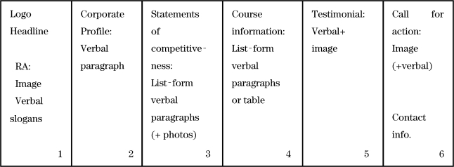 Reader attraction^(Corporate profile)^Statements of competitiveness^Courses info^(Testimonial)^(Call for action)^Contact information