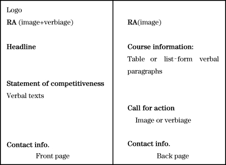 The typical mapping of the functional stages on the actual pages of English learning advertisements is illustrated in the two figures below.Figure 3.3 shows the mapping of the staging on a 6page foldable leaflet.Figure 3.4 shows the typical mapping of the staging on a two-page flyer.