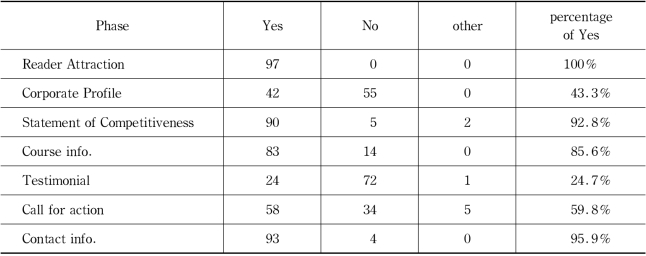 As Table 3.4 shows,all advertisements include a Reader Attraction stage,43.3%of them include the Corporate Profile,92.8%include the Statement of Competitiveness,85.6%include the Course Information,24.7%include a Testimonial stage,59.8%include a Call for action stage,and 95.9%include Contact Information.On the basis of the frequency of these stages in the whole corpus,the obligatory and optional stages are decided.The obligatory ones are Reader Attraction,Statement of Competitiveness,Course information and Contact Information whereas the optional ones are Corporate Profile,Testimonial and Call for action.