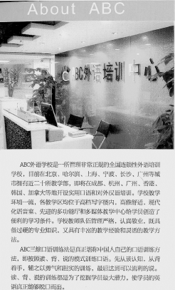The inclusion of pictorial component in this stage is also optional.In flyers few cases are found to include a visual part in the stage of Corporate Profile,actually,even the stage as a whole is highly optional as shown in Table 3.4.In the leaflets and brochures which do include a pictorial component in the Corporate Profile,the patterns vary to a large extent with the medium that carries them.That is,for leaflets and brochures which have very different capacities of visual space,the patterns of the visual texts vary accordingly.In general,pictures are more often seen in brochures than in leaflets.The frequently encountered visuals in the Corporate Profile in leaflets and company brochures can be grouped into the following two types.The first type,also the most popular type includes photos of the office or classroom of this language school,often shot with a high light key and institutional formality reflected through its design,and the modern and clean atmosphere.The following page(see Figure 4.11)is an example of this type.