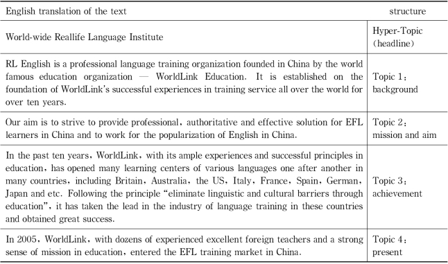 The verbal text is a blending of promotional and expository genres,which is organized around several Topics about the concerning company.As the genre of exposition typically unfolds rhetorically rather than chronologically(Martin and Rose,2008:132),the arguments in Corporate Profile texts are also rhetorically motivated.The initial Topic of the Corporate Profile text is usually a brief introduction of their company background.The following text unfolds with a sequence of related topics such as the history,achievements,mission and goals and future of the English language school/company.Although the actual sequence of these topics may vary from case to case,they follow a general pattern of development,that is,from past experience and achievement to the present project in China,and some also to future goal.The typical pattern of the Topics is generalized below,with some optional topics omitted.
