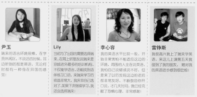 But the photo is not simply an addition to the verbal mode.Instead,it has many details due to the iconicity of the visual genre.As we have analyzed in Section 4.3.5,the photos in this stage show a lot of details which indicate that they show real persons in real environments.These details are not related to what the verbal appraisal is concerned with.They are even not there for the readers to read:readers will not even notice or care whether it is a female or a male shown in the picture if the name shows no obvious clue for sex,or if the verbal information for the witness'identity is“the parent of XXX”which is often the case for the children's programs.For example,Figure 5.9 shows testimonials of four customers.All of their photos are clearly shot in a real background with many details shown.However,these details are not relevant to the appraisal the customers are giving to the specific company.Actually,if examined carefully,some pictorial details are contradictory to the corresponding verbal texts:there are two boys in the rightmost photo while there is only one name shown in the verbal text below!