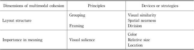 As summarized in the previous section,the two aspects of layout analysis that the three frameworks all acknowledge are the structure of document and the typographic features for salience which indicate importance in meaning.They correspond to global coherence relations and local coherence relations respectively.That is,surface cohesion includes the devices in the layout that signal the coherence relations,including global and local,among the semiotic elements in the discourse.The working principle for layout analysis used in the current study will be developed around the two aspects.