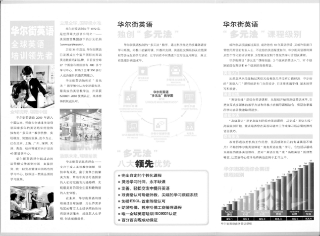 Apart from this example given above,another sample is given below(see Figure 6.8)to illustrate my point.It shows the inside page of a folder of WSE English training company.On its right-side page,there is a verbal text about the Corporate Profile of this company and three pictures of the office building and class scenes.On the middle page is the Statement of Competitiveness in which the learning method is emphasized.On the right page is the Course information.The location of the three stages on the pages cannot be changed because it is related to the relative importance attached to them.Specifically,brand image is more important than the persuasive information which,in turn,takes precedent before course information,because the reader won't read the course information if the persuasion is not effective.