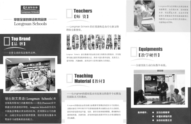 As described in the section about the staging of the English learning leaflets as a genre,although the content in these leaflets are highly variable,they tend to include some similar stages,such as Corporate Profile,Statements of Competitiveness which include almost invariably Teachers,Teaching method,Teaching material,
