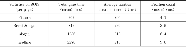 It means that the total gaze time participants spend on looking at verbal slogans is,on average,the longest,followed by picture,and brand receives relatively least looking time.This pattern of gaze time accords with the findings in Pieters and Wedel(2004)that“it is typical when consumers explore regular magazines at their own pace but lower than when advertisements are tested in laboratory conditions”.Therefore it suggests that the current experiment is successful in eliciting natural eye movement data from the participants.