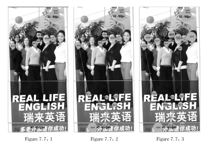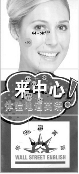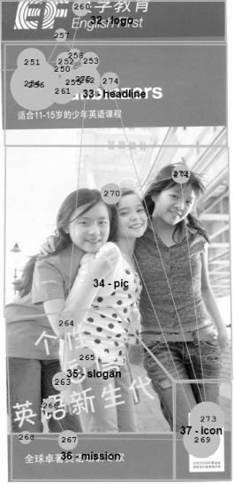 It's almost a universal phenomenon for viewers to view the page twice.For the first time they tend to look at the page in the directionality from top to bottom and from left to right.When they finish this first looking,they will have a quick review backwards.That is,their eye gaze will move quickly back across the sections they saw earlier,either without or with a small number of fixations.The gaze plot in Figure 7.5 is a typical example for the twice-reading.We can see that the participant started from the picture(Fixation 452)and went to the slogan(Fixation 453 to Fixation 456)and then to the logo at the bottom(Fixation 457 to Fixation 459).After the first reading,she went back from the bottom of page upwards,first to the verbal slogan(Fixation 460 and 461)and then to the picture(Fixation 462).