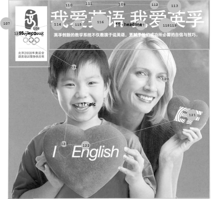 On the picture portions of the RA pages,the looking behavior was characterized by fewer fixation counts and long saccades.Actually,in many cases,the participants made a quick scan across the whole picture with few fixation on it(see the gaze plot in Figure 7.4).On the verbal portions of the pages,however,the looking behavior was characterized by dense fixation points,small saccade sizes,and longer gaze time.Figure 7.4 is an example of the different eye movement patterns of pictorial and verbal portions of a page.As it shows,the verbal elements are located on two locations of the page—the top and the bottom,whereas the picture occupies large area in the centre.The two verbal locations have much denser fixations and shorter saccades whereas the picture has only two fixations and long saccades.Actually the participant scanned quickly across the picture twice without fixating on it.