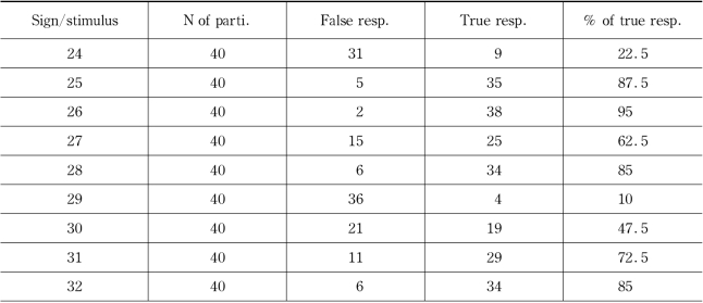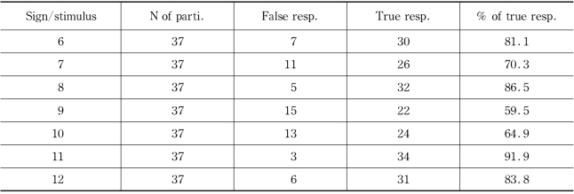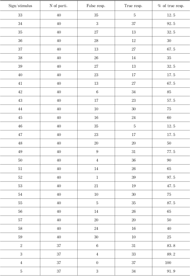 For each sign/stimulus,the numbers of participants that gave false responses and right responses were counted and the correction rate was computed(see Table 7.9 below).