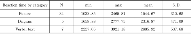 The mean reaction time for pictures is the shortest,1544.67 ms,that for verbal text is the longest,2885.92 ms and that for diagrams is in between,2316.87 ms.