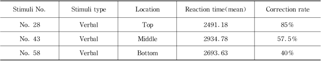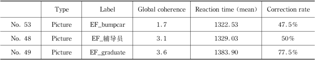 Stimuli 53,48 and 49 are pictures and they form a comparison pair because they differ only in the respect of global coherence while sharing similar degrees in all other respects,such as local coherence,size and location.They appear on the same page actually in the eye-tracking experiment.As shown in Table 7.14,higher score of global coherence leads to longer reaction time and higher correction rate whereas low global coherence corresponds to shorter reaction time and lower correction rate.