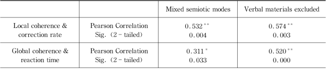 In order to check the influence of the different semiotic modes of the signs on recognition memory,the textual materials were excluded and a correlation test was performed on the pictorial and graphical materials.This time the results were very different:for local coherence and global coherence,the correlation coefficients were highly increased.Specifically,the correlation between local coherence and correction rate increased from 0.532 to 0.574(p<0.01);the correlation between global coherence and reaction time increased from 0.311(p<0.05)to 0.520(p<0.01).