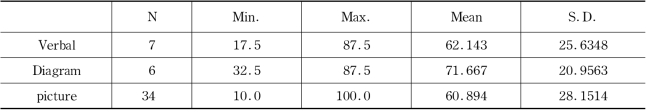 Table 7.10 below shows the mean correction rates of the verbal,diagrams and pictures.The correction rate for the diagram is the highest(71.7%),then the verbal(62.1%),and the picture is the lowest(60.9%).
