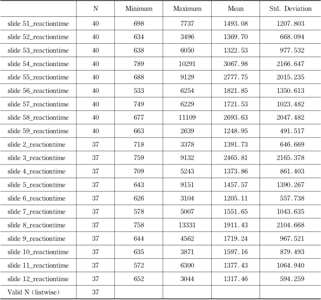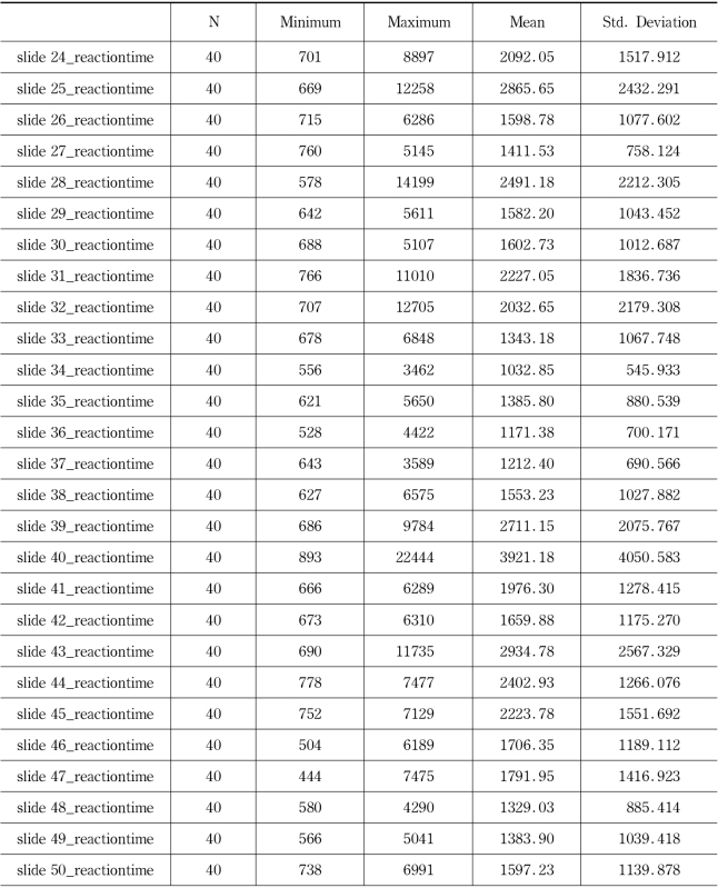 Table 7.7 Descriptive statistics of the reaction time for each slide