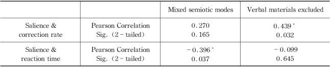 There is a significant negative correlation between the reaction time and salience(r=-0.396,p<0.05).It means that the more salient a sign is,the less time the participants spend in the judging process.No significant correlation was found between salience and correction rate in the recognition test.