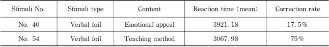 Scrutiny of these stimuli reveals that the stimuli correctly recognized by the largest number of participants are recognition foils.They take up all the 8 highest scores of correct rate and also 13 of the 17 items whose correction rates are higher than 80%.Further examination of these easily recognized foils reveals that all of them but one are pictures.In contrast,the verbal foils and diagram foils are not as easy to detect.