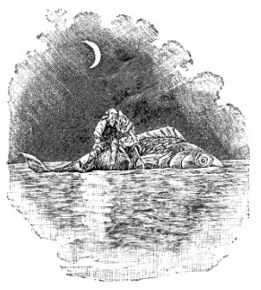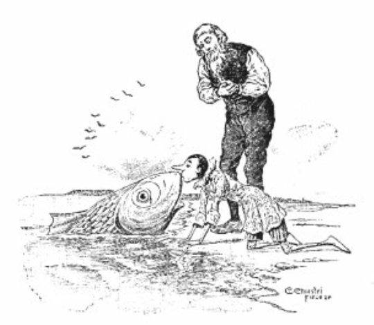 如你所想,杰佩托和匹诺曹马上接受邀请,但他们并没有抓住金枪鱼的尾巴,而是骑在它的背上,因为这样更舒服些。