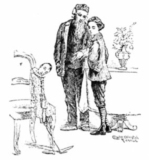 “我的爸爸去哪里了?”他忽然叫了起来。他走进旁边的房间,看见老杰佩托身体健康,容光焕发,和从前一样。他又干起了他的雕刻师的老本行,正在精细地雕刻一个精美的画框,上面刻满了叶子、花朵和各种动物的头。