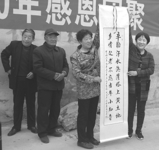 2018年10月,唐山二中25名当年知青回丰润新军屯塔六庄村与村民团聚。知青们接到原公社干部代表卢恩悦先生(左一)书写的楹联条幅。