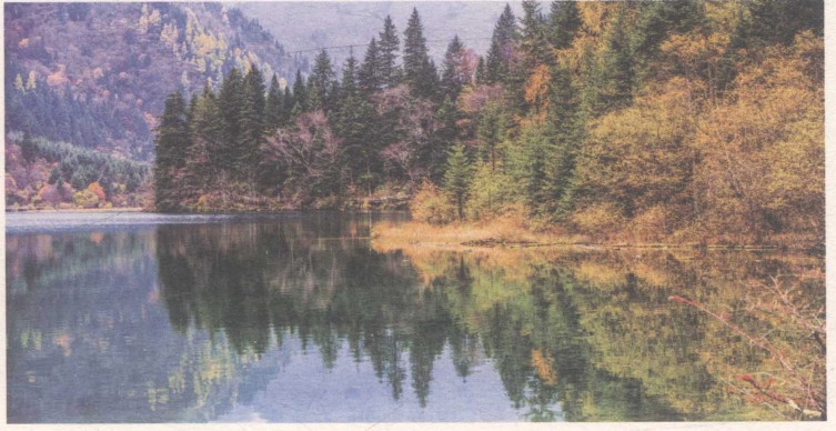 ▲面积17万平方米的九寨沟箭竹海,海拔2618米,湖畔箭竹葱茏、杉木挺立;水中山峦对峙,竹影摇曳;一汪湖水仍波光粼粼,充满生机。