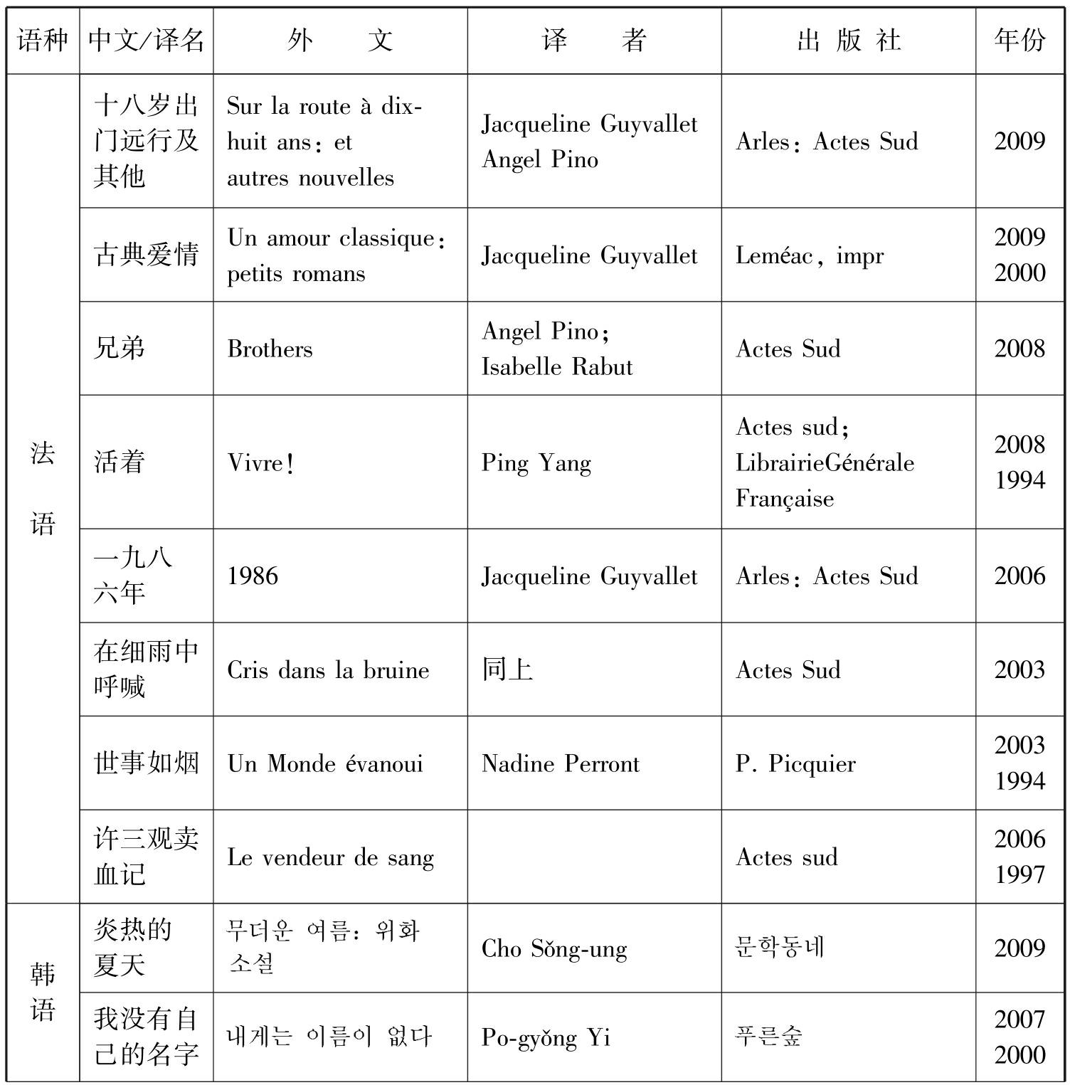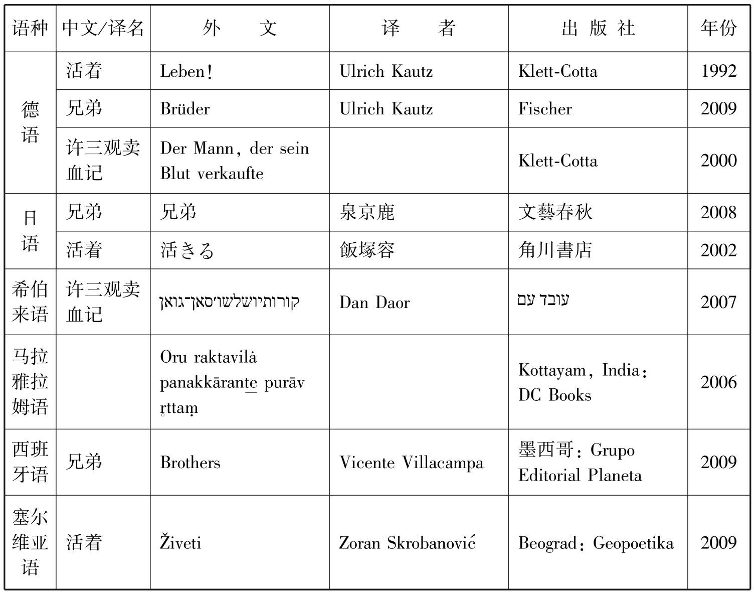表中没有出现的语种作品有:意大利文《折磨》(意大利Einaudi出版社,1997)、《许三观卖血记》(1999)、《世事如烟》(2004);《活着》(Donzelli出版社,1997;Feltrinelli出版社,2009);《在细雨中呼喊》(Donzelli出版社,1998);《兄弟》(上部,Feltrinelli出版社,2008;下部,2009)。荷兰文《活着》(De Geus出版社,1994)、《许三观卖血记》(2004)。葡萄牙文《活着》(巴西Companhia das Letras出版社,2008)、《许三观卖血记》、《兄弟》(长篇小说)。挪威文《往事与刑罚》(挪威Tiden Norsk Forlag出版社,2003)。希腊文《活着》(希腊Livani出版社,1994)。俄文《许三观卖血记》(俄罗斯《外国文学》月刊连载)。捷克文《许三观卖血记》(捷克Dokoran出版社)。斯洛伐克文《兄弟》(Marencin PT出版社,2009)。泰文《活着》(泰国Nanmee出版社)、《许三观卖血记》、《兄弟》。