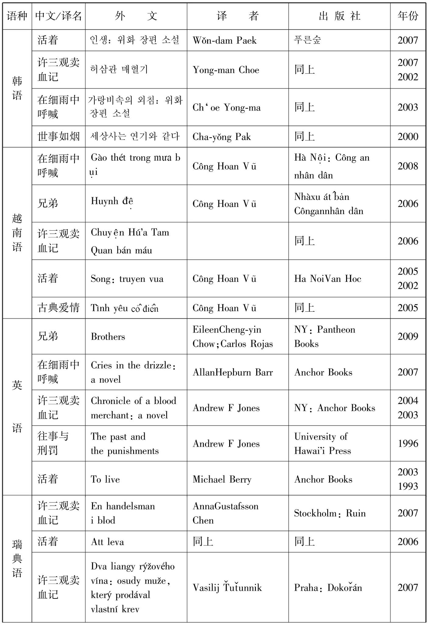 余华的作品翻译远不止于表中所列。根据余华自己博客提供的资料,表中出现但信息不完备的语种有:韩文《活着》(韩国绿林出版社,1997)、《许三观卖血记》(1999)、《在细雨中呼喊》(2004);《夏季台风》(韩国文学村庄出版集团)、《一九八六年》,《战栗》;《兄弟》(韩国人文出版社,2007);《灵魂饭》(2008)。越南文《活着》(越南文学出版社,2002)。德文《活着》(德国Klett-Cotta出版社,1998;btb出版社,2008);《许三观卖血记》(Klett-Cotta出版社,1999;btb出版社,2004)。西班牙文《活着》(西班牙Seix Barral出版社)、《许三观卖血记》、《兄弟》、《在细雨中呼喊》。印度Malayalam语《活着》(印度Ratna出版社)、《许三观卖血记》(印度Ratna,2005)。