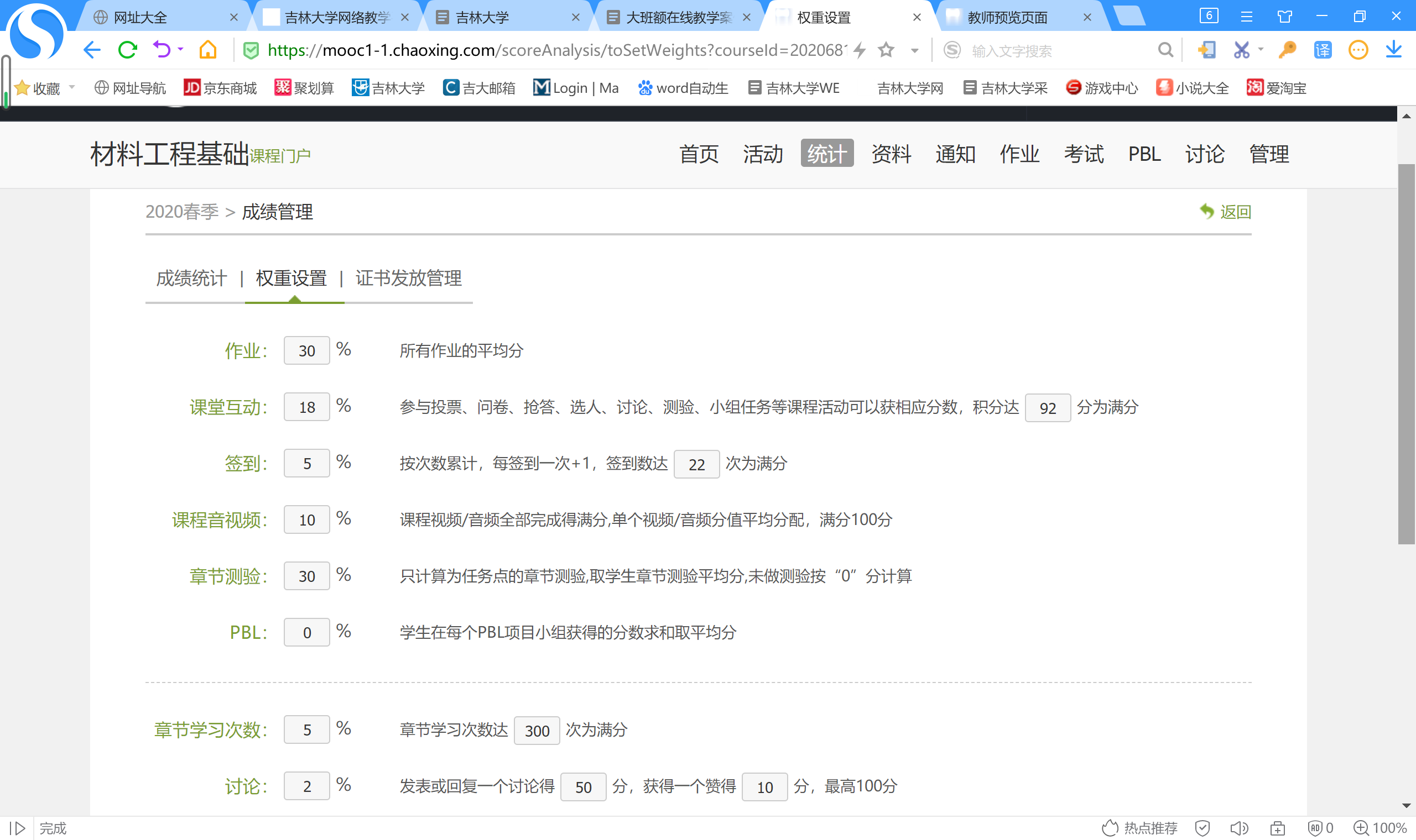 其中平时成绩包括:在线学习与互动(任务点浏览、签到、讨论、随堂测试等),在线作业,章测试,工业过程数值模拟,附加项(分组展示、实验等)。具体各项权重如下: