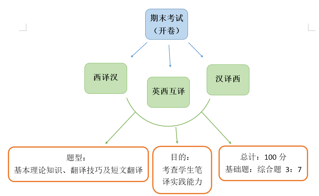 课程的终结性评价为期末考试,为开卷形式,试题题型由三部分组成:西译汉、汉译西及英西互译。试题内容包括基本理论知识、翻译技巧及短文翻译,共计100分。所有题型均以考查学生笔译实践能力为目的,试卷的基础题与综合题比例约为3:7。
