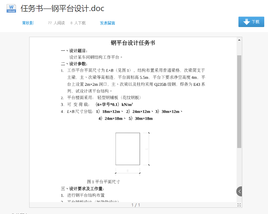 针对教学重点内容“钢平台设计”,结合理论学习设置实训“项目”——“某车间钢结构工作平台设计”。向学生下发设计任务书,给出设计参数、说明设计要求,做到一人一题。要求学生跟随教学进度,依次完成钢平台结构的平面布置、各类构件和连接节点的设计计算以及施工图的绘制,学生分组进行在线讨论、合作完成,实现“当堂学习、当堂设计”,使“项目”设计的整个过程贯穿理论学习的始终,内容完整、连贯,与实际工程相吻合。