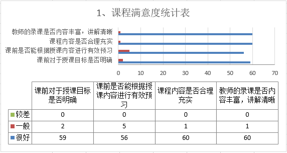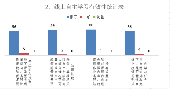 4个单选题,从结果可以看出学生认为课程设置合理,内容充实,教师录课内容丰富、讲解清晰,但仍有个别同学不能够自主完成课前的有效预习。