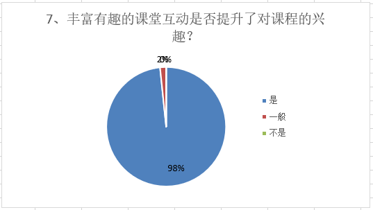1个单选题。本学期线上课程主要是在课堂互动方面进行了深入改革,推出了“6项线上互动”设计,主要目的是为了提高学生课堂参与度,提升自主学习效率。通过问卷可以看到绝大多数同学都认为效果很好,能够引发自己参与课堂互动的兴趣。