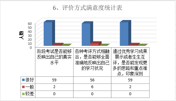 3个单选题。主要是考查学生们是否认为现有的评价体系能够准确合理、真实有效地反映出自己的学习状态和成果。从数据上看超过90%的学生认可现有评价体系,而剩下的不足一成的学生我们也应该认真听取他们的意见,以期进一步完善评价体系。