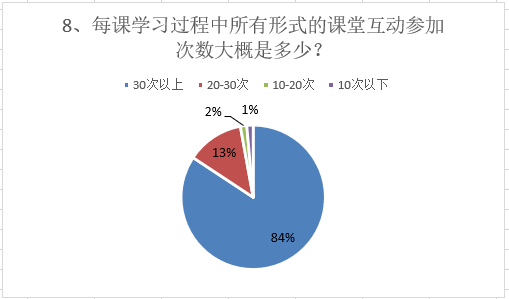 1个单选题。上面我们提到了本学期丰富多彩的课堂互动活动,每一课(8-10课时)为一个单元,同学们参与互动次数统计如下,84%的同学多于30次,平均3~3.75次/课时,13%的同学为20~30次,虽然这两部分同学占了97%,但是我更关注的是剩下的3%,他们参加课堂互动频次低的原因是什么?如何解决?这是接下来课程设计中所需要考虑到的。
