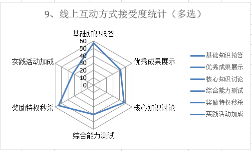 1个多选题。从图中可以看出,“基础知识抢答”“优秀成果展示”“核心知识讨论”“综合能力测试”“奖励特权秒杀”这5项,选择的人数均超过了30人,其中“基础知识抢答”和“奖励特权秒杀”选择人数分别高达57和55人,这两个互动也是本次课程中的创新和亮点,通过数据我们可以看出,学生是渴望竞争,期待挑战的,今后在教学中也仍然可以进一步完善相应环节,并将其正式纳入到考评体系中。另外,“实践活动加成”选择人数只有32人,主要原因是因为学生仍然处于初级阶段,对于参加各级各类比赛信心不足,这一方面今后可以为学生提供符合其学习阶段的相关竞赛。