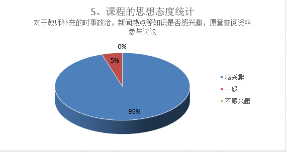 1个单选题。对于教师补充的时事政治、新闻热点(本学期主要是疫情相关报道、国际舆论走向与大国外交、及中日友好往来历史等),95%的同学愿意查阅资料参与讨论。并且在讨论中能够形成“头脑风暴”,学生们思想层面大有潜力可以挖掘和引导。