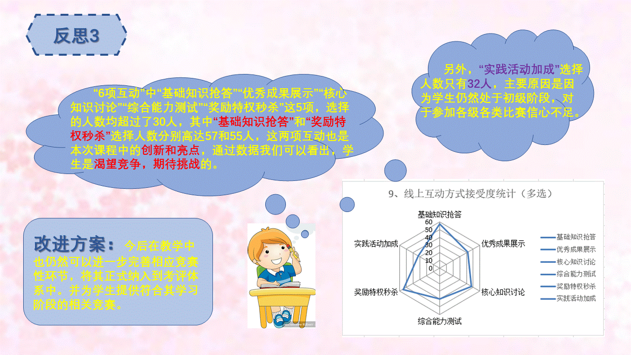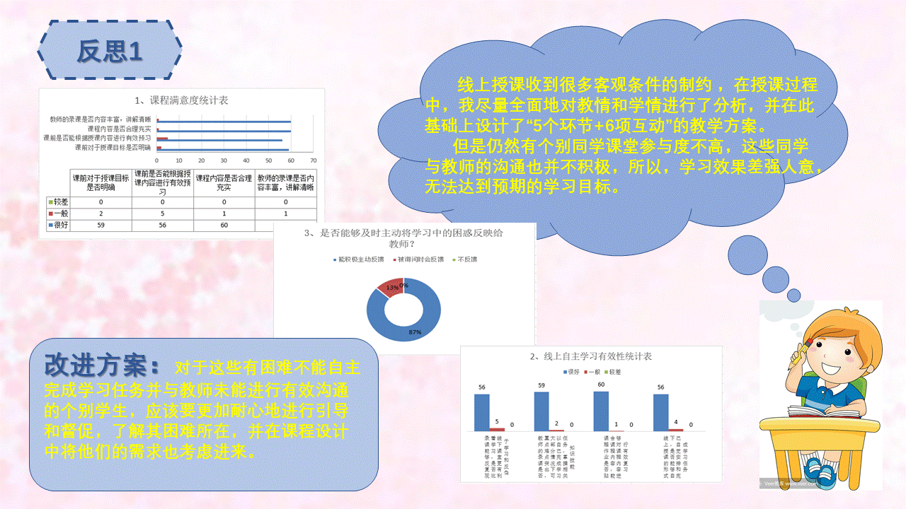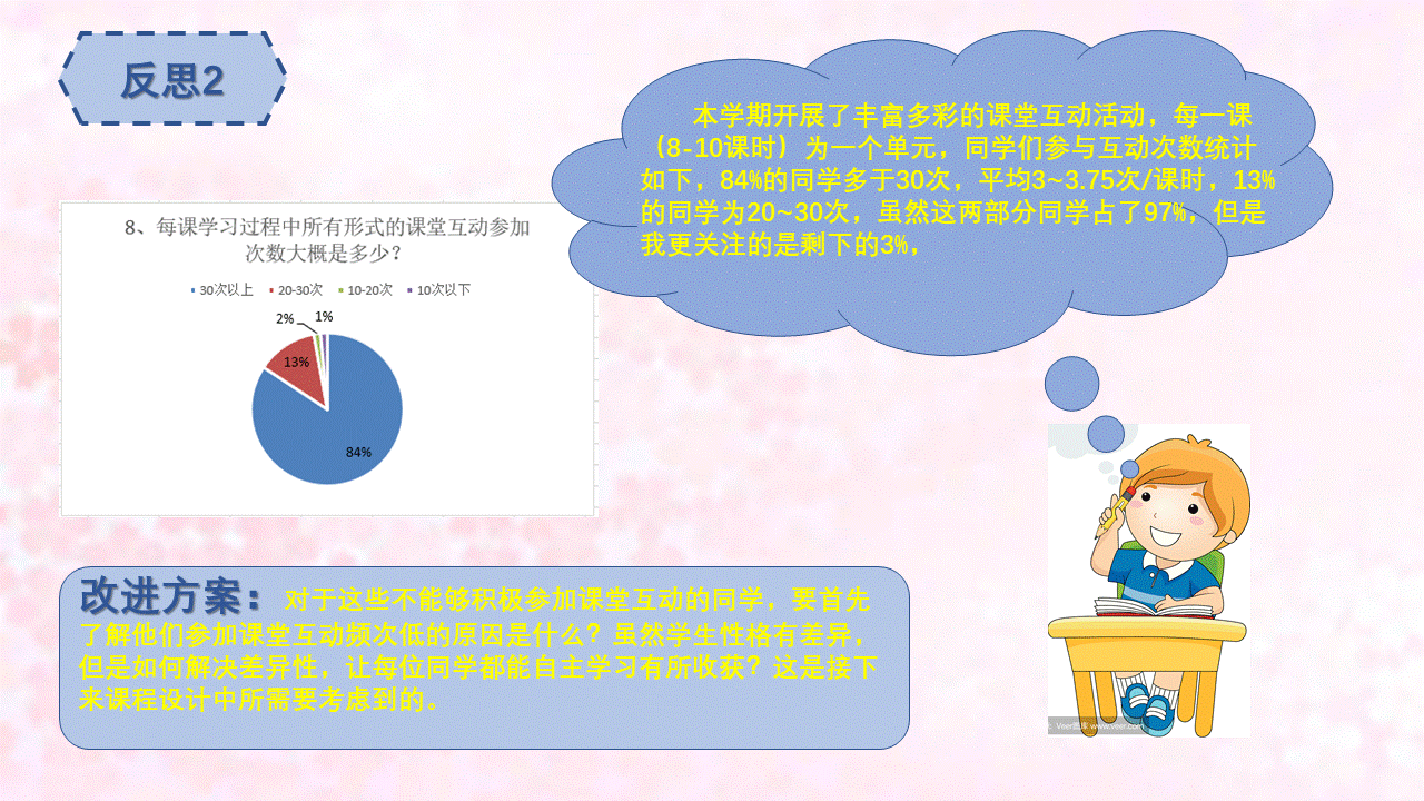 通过本学期17周的教学活动和学期末学生们对线上授课的问卷调查,我对课程进行了如下反思,并进一步深入思考改进方案。