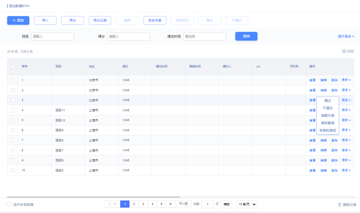 管理员登录表单后台,可以对表单数据进行管理操作:可以直接添加、复制或导入、导出数据,可以发放数据采集、数据修正,可以查看、编辑、删除数据,可以对数据进行检索、筛选查看,还可以编辑模板对数据进行自定义打印。